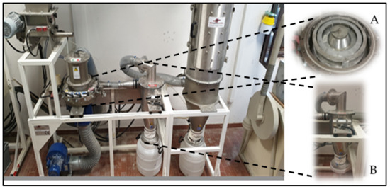 The plant was improved through the insertion of a programmable logic control (PLC) able to manage both the frequency and the action time of the airflow inside the separation chamber. Additionally, the chamber was further improved by the modification of the internal orbits that had been made according to a progressive decrease in the internal section. The latter modification allowed us to enhance the separation between the fine fractions and the coarse ones (Figure 3).