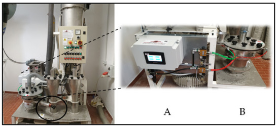 Air-classifier pilot plant augmented through the addition of a programmable logic controller (PLC) for the pneumatic flow management (A) and a chamber designed with a decreasing section (B). The circle indicates the setting airflow inlet valve. The F and G housings are placed below the steel plan located under the inlet valve.