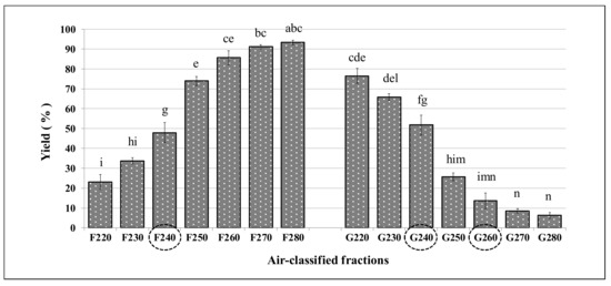 As expected, the air-classified fractions showed marked differences between the F and G fractions (Figure 4). In detail, the F fraction showed yield values with an ascending trend from 23% (registered for setting 220) to 93% (for setting 280). Conversely, a descending trend was observed for the G fractions, varying from 77% (setting 220) to 6% (setting 280). Yield recovery of the F fractions clearly exceeded 60% only for setting conditions ranging from 250 to 280. In the G fractions, this value exceeded only at 220 and 230 settings.