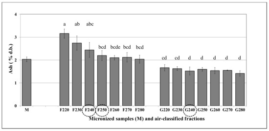 The ash content is an important quality parameter influenced both by genetic and environmental factors and associated with bran content [21]. In this study, the assay of the ash percentage proved useful to better characterize each air-classified fraction in any case containing both bran and semolina particles in different ratios.