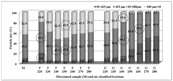 Mean percentages of particle size in micronized samples (M) and air-classified fractions (F and G types) of the mean of three cultivars. Circles highlight the fractions with significant differences (p < 0.05) among cultivars (n = 2).