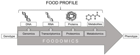 New challenges and the development or improvement of analytical methods in the last years come with the need for new approaches enabling a holistic way to evaluate food products [1,2]. Foodomics is not really a well-defined term being used to unite the analytical technologies and disciplines of the omics-cascade with research questions in food and nutrition [1,3]. Genomics, proteomics, and metabolomics are part of the so-called omics-cascade, comprising disciplines, technologies, and methodologies that are commonly used to describe the whole profile of food compounds [4]. Figure 1 illustrates schematically this cascade. These applications are often also called high-throughput technologies, producing a substantial amount of data [5,6,7]. Every discipline provides different information about the composition of the target. As the analytical date collected is steadily increasing, a new approach is the integration of a mathematical/bioinformatic point of view into foodomics. The first discipline of the omics-cascade is genomics and focuses on the investigation of the entire genome, meaning all genetic material of an organism based on the four bases DNA code with its 64 codons, allowing a countless number of sequences. Because of the low adaption to exogenous influence factors, the genome is predominantly stable and offers a valuable tool for the differentiation and identification of species.