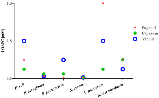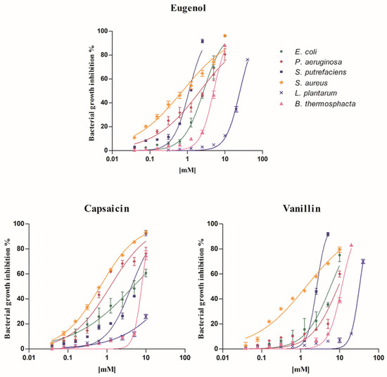 | Bacterial Strain | Eugenol | Capsaicin | Vanillin | |||