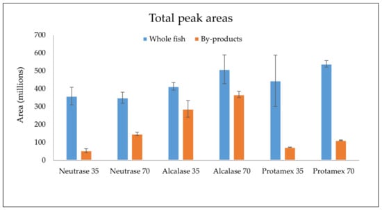Total peak areas in HS-SPME-GC-MS chromatogram of all identified volatile compounds (N = 41) from different enzymatically extracted oils from whole fish (blue bars) and by-products (orange bars) of Baltic herring.