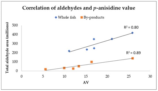 Out of all the identified volatile compounds, 17 were aldehydes including acetaldehyde, 2-propenal, propanal, butanal, 2-methylbutanal, 3-methylbutanal, (Z)-2-butenal, (E)-2-pentenal, hexanal, 2-methyl-4-pentenal, (E)-2-hexenal, heptanal, (E,E)-2,4-hexadienal, (Z)-2-heptenal, octanal, (E,Z)-2,4-heptadienal and nonanal. Aldehydes are secondary oxidation products, which can also be measured with AV. The correlation between aldehydes and AV in the oils extracted from whole fish had a correlation factor of R2 = 0.80, whereas the corresponding one for by-products was R2 = 0.89 (Figure 2).