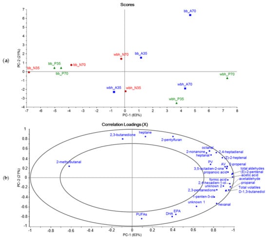 Principal component analysis (PCA) of volatile compounds that were most influential in PCAs with all identified volatiles, total volatile and aldehyde peak areas, EPA, DHA and PUFA contents, and AVs and PVs. Both raw materials were analyzed together and marked to the figures as bb (by-products) and wbh (whole Baltic herring). The enzymes are marked as their initials: A for Alcalase, N for Neutrase and P for Protamex. The figures are (a) scores plot and (b) correlation loadings of principal components PC1 and PC2. The data was normalized (auto normalization) and centered (mean centering).