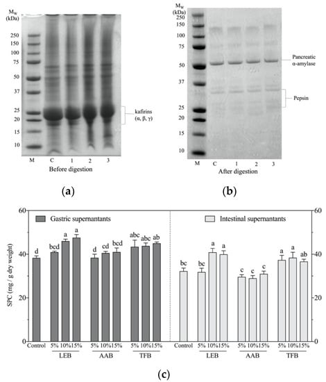 SDS-page analysis of sorghum biscuits enriched with mushroom powder (15% substitution) (a) before and (b) after gastrointestinal digestion. (c) Soluble protein content (SPC) of biscuits after in vitro gastrointestinal digestion. (M—marker; C—control biscuit; 1—15% L. edodes biscuit; 2—15% A. auricula biscuit; 3—15% T. fuciformis biscuit). Error bars represent standard deviation (n = 3). Columns with different letters are significantly different within the same chart (p < 0.05). LEB—L. edodes biscuit; AAB—A. auricula biscuit; TFB—T. fuciformis biscuit.