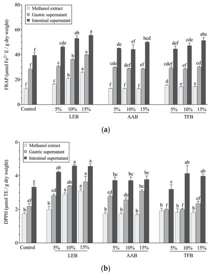 In vitro bio-accessible antioxidant activity of mushroom-enriched sorghum biscuits assessed by Ferrous reducing antioxidant power (FRAP, a) and Diphenyl-2-picrylhydrazyl radicals scavenging ability (DPPH, b). Values are means ± standard deviation (n = 3). The statistical analysis of significance was performed between 10 of the biscuit samples for each fraction (methanol extract, gastric supernatant and intestinal supernatant). Products with different letters are significantly different (p < 0.05). LEB—L. edodes biscuit; AAB—A. auricula biscuit; TFB—T. fuciformis biscuit.