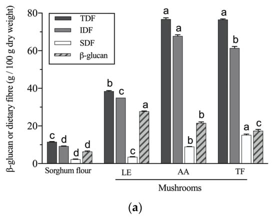 β-glucan is abundant in both cereals and mushrooms, and it can bring various disease prevention properties, such as reducing postprandial blood glucose and lowering LDL cholesterol. The sorghum flour contained a total of 6.41 g/100g dw of β-glucan, which was much lower than mushroom samples, as can be seen in Figure 3a. The L. edodes had a high content of β-glucan (27.78 g/100g dw), A. auricula had slightly less (21.55 g/100g dw) and T. fuciformis had least (17.44 g/100g dw), and the results are similar to the β-glucan content of several other mushroom cultivars (9 to 27 g/100g dw) [55]. Cereal β-glucan has a fibrous structure with a combination of 1-3 β-glycosidic and 1-4 β-glycosidic linkages, while mushroom β-glucan mainly consists of 1-3 β-glycosidic with 1-6 β-glycosidic branches. The different sources of β-glucan have diverse molecular structures, such as molecular weight, conformation and branching degree, influencing their solubility, viscosity and rheological characteristics [56]. For example, the chemical structure and molecular weight of β-glucan are two main factors that determine the solubility of β-glucan [57]. The sorghum flour, L. edodes and A. auricula all had a much lower soluble fibre content than β-glucan content, especially L. edodes samples indicating that more β-glucan is water-insoluble in L. edodes. Morales, et al. [58] found that Lentinula edodes had a low yield (4.2%) of hot water-soluble extract and a high content (27%) of β-glucan, which was consistent with L. edodes mushroom used in this study. They further determined the β-glucan of the hot water-soluble extract and the resulting insoluble fraction after extraction, finding that the insoluble fraction had a higher content of β-glucan (38%) than the soluble extract (13.2%). The solubility of β-glucan largely depends on the percentage of 1-3 β-glycosidic linkages, because this type of linkage leads to twists in the straight-chain polymer allowing water molecules to enter into the chains [59]. Lentinan is a water-soluble polysaccharide from L. edodes with a primary structure of the (1-3)-β-D-glucan [60]. The solubility might also be influenced by interactions with other macronutrients in mushrooms, such as insoluble fibre and proteins [61]. β-glucan could covalently connect with the chitin (insoluble fibre) [62], leading to a high content of insoluble β-glucan content in mushroom samples. Alahmed and Simsek [57] found a decrease in the solubility of oat β-glucan due to the increase of molecular weight because of a rise in cohesive energy density. The molecular weight of β-glucan also relates to its viscosity and thus affects its functionalities (such as hypoglycaemic and hypocholesterolemic properties) [56].