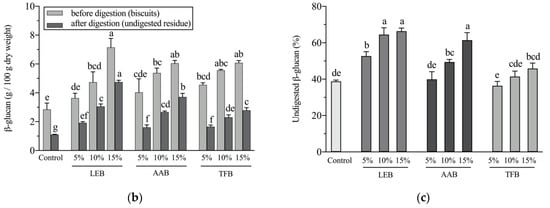 β-glucan and dietary fibre content of sorghum flour and mushrooms (a); and β-glucan content of biscuits and undigested residue (g/100 g dry weight biscuit) (b); and the undigested β-glucan (%) after gastrointestinal digestion (c). Undigested β-glucan (%) was calculated by the following formula: Undigested β-glucan (%) = (gram of β-glucan in the undigested residue/gram of β-glucan in the initial biscuits) × 100. Values = means ± standard deviation (n = 3). The statistical analysis of significance was performed between four of the materials for figure (a) and between 10 of the biscuit samples for figures (b,c). Products with different letters are significantly different (p < 0.05). LEB—L. edodes biscuit; AAB—A. auricula biscuit; TFB—T. fuciformis biscuit.