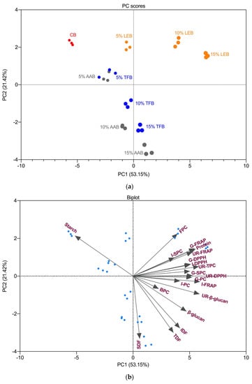 Principal component analysis of principal component scores biplot. PC scores distribution of different biscuit samples incorporated with dried mushrooms (a) and Biplot component loading (b) as obtained from the principal component analysis. Abbreviations: CB—control biscuits; LEB—L. edodes biscuit; AAB—A. auricula biscuit; TFB—T. fuciformis biscuit; FPC—free phenolic content biscuits; BPC—bound phenolic content of biscuits; G-PC, G-FRAP and G-DPPH represent the phenolic content and antioxidant activity of gastric supernatant; I-PC, I-FRAP and I-DPPH, represented the phenolic content and antioxidant activity of intestinal supernatant; G-SPC—soluble protein content of gastric supernatant; I-SPC—soluble protein content of intestinal supernatant; TDF—total dietary fibre; SDF—soluble dietary fibre; IDF—insoluble dietary fibre; UR-TPC, UR-FRAP and UR-DPPH represented the total phenolic content and total antioxidant activity of the undigested residue; UR-β-glucan—β-glucan content of undigested residue.