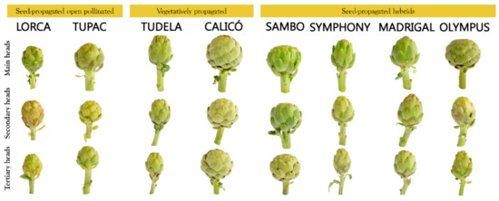 Main, secondary, and tertiary heads of seed-propagated open-pollinated cultivars (‘Lorca’ and ‘Tupac’), vegetatively propagated cultivars (‘Blanca de Tudela’ and ‘Calicó’), and seed-propagated hybrids (‘Sambo’, ‘Symphony’, ‘Madrigal’, and ‘Olympus’).