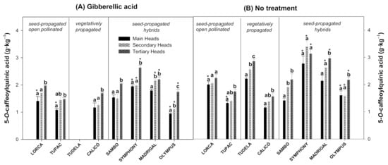 The 5-O-caffeoylquinnic acid content (g·kg−1) of globe artichoke cultivars influenced by flower head order (main, secondary, and tertiary heads) and treatment (gibberellic acid (A) or no treatment (B)). Data are the mean ± SE. Different letters show significant differences (p < 0.05 according to HSD Duncan’s test) among flower head orders for each artichoke cultivar and treatment. Significant differences between both treatments (p < 0.05 according to Student’s t-test) were expressed as * placed in each flower head order for each artichoke cultivar.