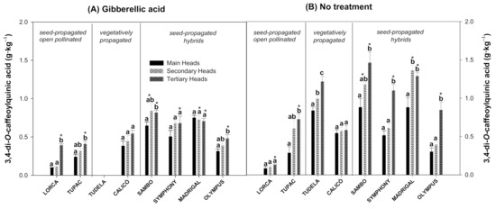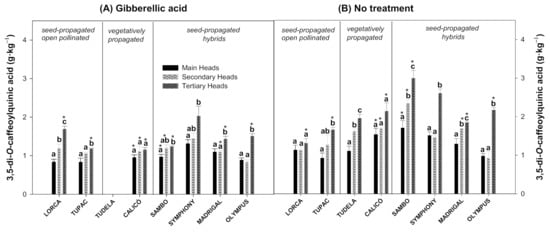 The 3,5-di-O-caffeoylquinnic acid content (g·kg−1) of globe artichoke cultivars influenced by flower head order (main, secondary, and tertiary heads) and treatment (gibberellic acid (A) or no treatment (B)). Data are the mean ± SE. Different letters show significant differences (p < 0.05 according to HSD Duncan’s test) among flower head orders for each artichoke cultivar and treatment. Significant differences between both treatments (p < 0.05 according to Student’s t-test) were expressed as * placed in each flower head order for each artichoke cultivar.
