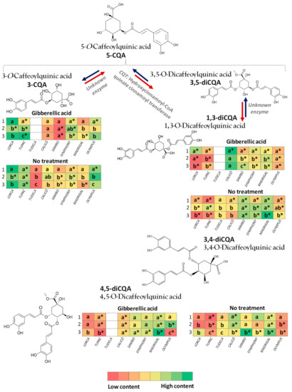 On the other hand, 1,3-diCQA is derived from 3,5-diCQA by an unknown enzyme. Most of the cultivars studied, ‘Lorca’, ‘Tupac’, ‘Sambo’, ‘Symphony’, ‘Madrigal’, and ‘Olympus’, showed significant differences in the 1,3-diCQA content between the three flower head orders. In these cultivars, the 1,3-diCQA content was significantly higher in untreated artichokes and in the tertiary heads than in the main and secondary heads. The 4,5-diCQA is derived from the same biosynthesis pathway as 1,3-diCQA from the biosynthesis of 3,5-diCQA mediated by the CQT enzyme (hydroxycinnamoyl-CoA quinate cinnamoyl transferase). No significant differences were observed in the 4,5-diCQA content among flower head orders of the ‘Calicó’, ‘Sambo’, and ‘Symphony’ cultivars treated with GA3. The 4,5-diCQA content was significantly higher in tertiary heads than in secondary heads, however, and the secondary heads showed more 4,5-diCQA than the main heads in the GA3-treated ‘Olympus’ artichokes and in the untreated ‘Tupac’ and ‘Tudela’ artichokes. The GA3 treatment significantly reduced the 4,5-diCQA levels in the three flower head orders of the ‘Tupac’, ‘Calicó’, and Madrigal’ cultivars.