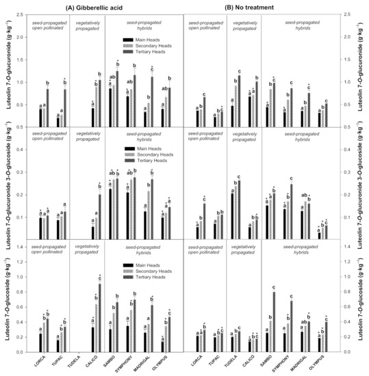 Luteolin 7-O-glucuronide, luteolin 7-O-glucuronide 3-O-glucoside, and luteolin 7-O-glucoside content (g·kg−1) of globe artichoke cultivars influenced by flower head order (main, secondary, and tertiary heads) and treatment (gibberellic acid (A) or no treatment (B)). Data are the mean ± SE. Different letters show significant differences (p < 0.05 according to HSD Duncan’s test) among flower head orders for each artichoke cultivar and treatment. Significant differences between both treatments (p < 0.05 according to Student’s t-test) were expressed as * placed in each flower head order for each artichoke cultivar.