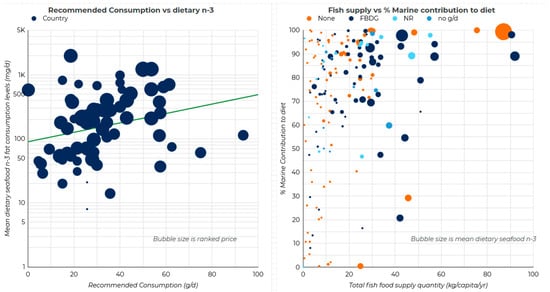 (Left) The comparison between the recommended consumption (g/d, [27]) and mean dietary seafood LCn-3 consumption [20], with bubble size indicating the ranked price [29]; (right) the total fish supply vs. the proportion of that which is of marine origin [28], with a bubble size of mean dietary seafood LCn-3 [20]. Interactive data are available at https://www.tlusty.solutions/n3.html (accessed on 28 June 2021).