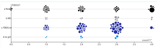 The number of countries that have 0–4 positive attributes for seafood consumption: GDP [38], ranked fish price [29], and total fish and percentage of marine fish available [28]. Positive attributes indicate that the country is above the median, except in the case of ranked fish price, which has a negative association with dietary LCn-3, and thus is inverse. The countries are split into (a) those that do not have an FBDG (None); (b) those that have no seafood recommendation in their FBDG (NR); (c) those that have a seafood recommendation in g/d (FBDG-s); and (d) those that have a seafood recommendation, but g/d is not specified (no g/d). Size of the bubbles indicates the country-level LCn-3 consumption [20].