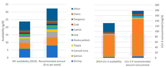 (Left) The availability of seafood species for American consumers in 2019 [34] and the values of each of those species if Americans consumed an aggregate 8 oz per week [31]. (Right) Dietary LCn-3 [42] for Americans based on seafood species available in 2019, and if they were to consume the recommended amount of seafood.