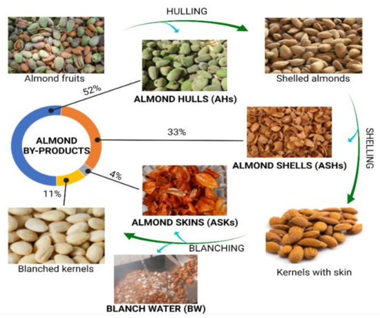 Almond (Prunus dulcis (Mill.) D. A. Webb, Prunus amygdalus Batch, or Amygdalus communis L.) constitutes the most produced nut worldwide, thanks to its exceptional nutritional composition, including low sugar content, high levels of proteins, unsaturated fatty acids, vitamins, and minerals, as well as health-enhancing phytochemicals [1]. Among the countless almond varieties and cultivars, the Mission, Nonpareil, and California contribute up to 90% of the current worldwide production [2]. The data from the Food and Agriculture Organization (FAO) indicates that over 3 million tons of almond fruits are yearly produced throughout an area of over 2 million ha, being USA (78%), specifically California, Australia (8%), and Spain (6%) the largest producers [3]. Besides fruits, almond production involves the generation of several by-products that are normally discarded, accounting 0.8–1.7 million tons for shells and more than 6 million tons for almond hulls [4,5]. Consequently, the accumulation of almond by-products is causing an increasing concern about their processing, and novel solutions are required to add value to these residues, with the aim of improving the economic profit and environmental sustainability of the large-scale almond production.