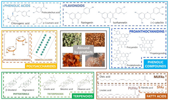 Among the different bioactive compounds (BCs) found in almond by-products most reports have been focused on phenolic compounds, including mainly phenolic acids and flavonoids, polysaccharides, terpenoids, and fatty acids (Figure 2). Thus, a recent review by Prgomet et al. [4] widely reported the characterization of almond by-products as a promising source of bioactive compounds, especially phenolic compounds. In addition, these authors review the functional properties of such compounds on the prevention of degenerative diseases. Consequently, an in-depth description of bioactive compounds of almond by-products is required to provide insight about the potential uses of these resources in the field of natural product research.