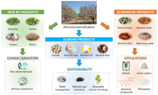 As stated throughout this review, almond by-products can be incorporated in a wide range of foods because of their nutritional and phytochemical composition. Almond intensification (Figure 3) provides a wide range of products, mainly focused on the food and cosmetic industries, including kernels, milk, oil, and flour. In the same way by-products have been exploited by means of different applications. Intense efforts are being developed with the aim of achieving a sustainable exploitation of the great amounts of waste generated during almond production, in order to establish a solid circular economy system around this sector.