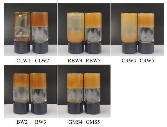 As shown in Figure 1, CLW had the best gelation effect among the investigated samples, forming a gel with SO at an addition level of 2 wt.%. Table S1 indicates the minimum quantity (wt.%) required for SO gelation and composition of gelling agents. As previously reported [22,23,24], CLW predominantly consists of 49–50% n-alkanes (C29–C33), 20–29% esters of acids and alcohols with even-numbered carbon chains (C28–34), 12–14% resins (mainly triterpenoid esters), and 7–9% free acids. Abdallah and Weiss [25] showed that n-alkanes are the structurally simplest organic gelling agents and that the stability of a gelled oil increases as the n-alkane chain length increases. Morales-Rueda, Dibildox-Alvarado, Charó-Alonso, Weiss and Toro-Vazquez [23] investigated the thermal and oil-holding properties of the main component of CLW, n-tridodecane (C32), when added to safflower oil to prepare oleogels. They found that C32 oleogels have a better self-assembly ability than CLW oleogels, which indicates that the n-alkanes in CLW have a better gelation ability than the minor components. Thus, the high content of C29–C33 n-alkanes in CLW (49–50%) may be responsible for the better gelling ability of CLW than that of other waxes. BW is a mixture of odd-numbered hydrocarbons (mainly heptacosane), even-numbered hydrocarbons, odd-numbered monounsaturated hydrocarbons, fatty acid esters combined with long-chain alcohols, and free wax acids [26]. BW was also shown to be a good gelling agent for SO, with the formation of a stable gel observed at a concentration of 3 wt.%. Esters derived from long-chain saturated fatty acids (C24 and C22) and long-chain saturated fatty alcohols (C28–C34) are the major components in RBW [27]. In contrast to the results reported by Hwang, Kim, Singh, Winkler-Moser and Liu [24], which showed good gelation of soybean oil with RBW, the critical concentration of RBW for SO gelation was 5 wt.%. This difference in behavior may be due to variations in the wax composition with season, region, and purity, indicating that knowledge of the exact composition is important for understanding the gelation properties of a wax. The main components of CRW are 84–85% aliphatic and aromatic esters (including 40% aliphatic esters, 13% ω-hydroxy esters, and 8% cinnamic aliphatic diesters) [28]. The critical concentration of CRW was 5 wt.% owing to the weak gelation ability of the mixture of aliphatic esters and p-hydroxycinnamic aliphatic diesters. GMS, consisting of 84.5% monostearin and 12.2% monopalmitin, is one of the most commonly used gelling agents. The critical concentration of GMS in SO was 5 wt.%. Thus, the gelation ability of GMS was similar to that of RBW and CRW but weaker than that of CLW and BW.