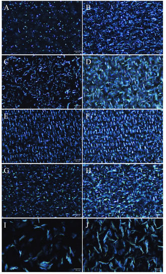 Polarized light microscopy images of CLW oleogels at critical (A) and 8 wt.% concentrations (B). Polarized light microscopy images of RBW oleogels at critical (C) and 8 wt.% concentrations (D). Polarized light microscopy images of CRW oleogels at critical (E) and 8 wt.% concentrations (F). Polarized light microscopy images of BW oleogels at critical (G) and 8 wt.% concentrations (H). Polarized light microscopy images of GMS oleogels at critical (I) and 8 wt.% concentrations (J). All images were taken at 40× magnification at 25 °C. Scale bar = 30 μm.