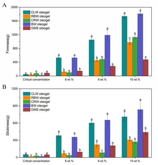 Firmness (A) and stickiness (B) of the oleogels at room temperature (~25 °C). Sample preparation and analyses were performed in triplicate, and the results were expressed as mean with error bar. Different letters represent statistical differences between values within each panel (p < 0.05).