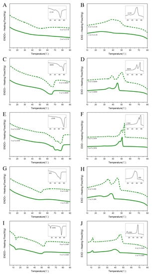 DSC thermograms during heating (A) and cooling (B) of CLW oleogels. DSC thermograms during heating (C) and cooling (D) of RBW oleogels. DSC thermograms during heating (E) and cooling (F) of CRW oleogels. DSC thermograms during heating (G) and cooling (H) of BW oleogels. DSC thermograms during heating (I) and cooling (J) of GMS oleogels.