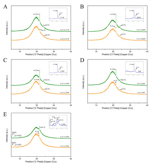 The X-ray diffractograms of oleogels formed by different gel factors at critical and 8 wt.% concentrations, (A) CLW oleogels; (B) RBW oleogels; (C) CRW oleogels; (D) BW oleogels; (E) GMS oleogels.