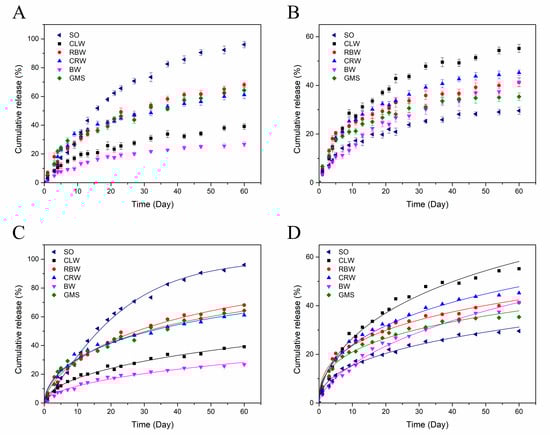 The second category of compounds was exemplified by nonanal. As shown in Figure 6B, after 60 d of open storage, nonanal had the best retention effect in SO, with a cumulative release rate of only 29.58% and a k value of 0.0019. For the GMS oleogel, the cumulative release rate was 35.37% with a k value of 0.0025. When the release process was finished, there was no significant difference in the nonanal content in the RBW, CRW, and BW oleogels, and the cumulative release rate was 41.23–45.22%. Unlike the retention effect observed for the first type of compound, the addition of CLW promoted the release of nonanal. It is speculated that the main n-alkane components of CLW may compete with the binding sites for the hydrophobic flavor substances, thus decreasing the stability. In addition, the n values for nonanal in SO and the oleogels were 0.3943–0.6352, which corresponds to the release mechanism between restricted diffusion and a first-order reaction. In general, the addition of gelling agents promoted the release of the second type of compounds to varying degrees, but due to their low saturated vapor pressures, losses after storage is relatively low and has little effect on the overall flavor. Overall, the BW oleogel exhibited a good retention effect on flavor molecules with different physicochemical properties. Thus, this gelling agent can be used to establish a controllable flavor delivery system and realize SO flavor stabilization and retention technologies.