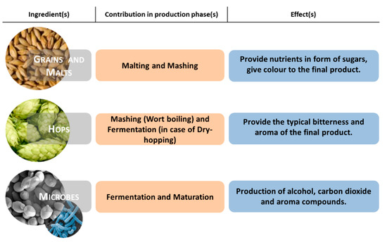 Considering the above, there is increased interest in the ingredients and raw materials involved in the beer production process, which could be simplified into four steps: malting, mashing, fermentation, and maturation. The principal ingredients are mainly water, barley malt, hops, and yeast. Figure 1 shows the participation of the production phases of the main raw materials and their effects on the final product. In addition, the list of traditional ingredients can be extended according to the beer style and the breweries. In fact, it is assumed that specific raw materials could provide different flavours, aromas, and sensory attributes [3]. In this regard, the use of autochthonous biological inputs could provide several benefits, e.g., reducing the production and supply costs and creating a strong connection with territories that give added value to the final products.