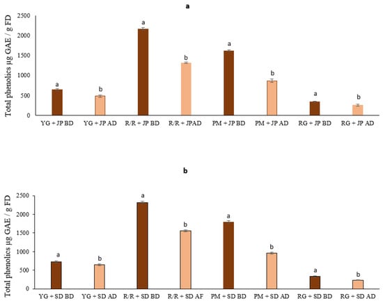 The levels of total phenolics and bioaccessibility of cooked potato varieties mixed with roasted JP (a) and with roasted SD (b). Data are the mean of three replicates with standard deviation and are expressed as per gram of freeze-dried weight. Significant differences are denoted by different letters, while the same or shared letters indicate that they are not significant to each other. BD and AD: before and after digestion.