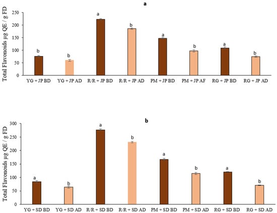 The levels of total flavonoids and bioaccessibility of cooked potato cultivars mixed with roasted JP (a) and roasted SD (b). Data are the mean of three replicates with standard deviation and expressed as per gram of freeze-dried weight. Significant differences are denoted by different letters, while the same or shared letters indicate that they are not significant to each other. AD and BD: before and after digestion.