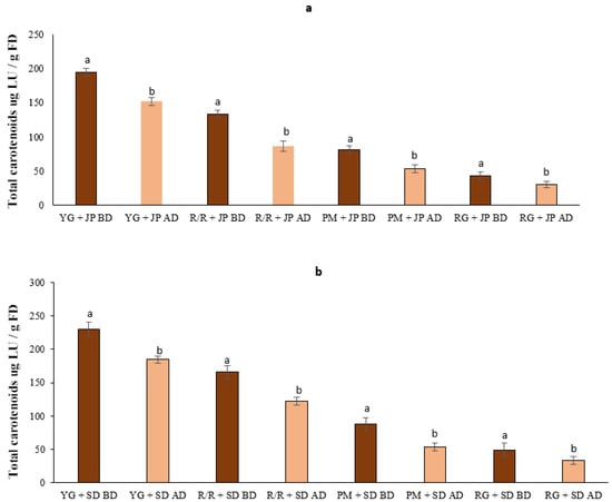 Several studies reported that the differences in total carotenoid content among samples have been attributed to variety, maturity stage, and cooking methods, and the presence of other nutrients such as fat and fiber [18,35,36].