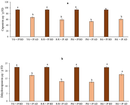 The levels of capsaicin and bioaccessibility of capsaicin of cooked potato cultivars mixed with roasted JP (a) and the levels of dihydrocapsaicin and bioaccessibility of dihydrocapsaicin of cooked potato cultivars mixed with roasted JP (b). Data are the mean of three replicates with standard deviation and are expressed as per gram off freeze-dried weight. Significant differences are denoted by different letters, while the same or shared letters indicate that they are not significant to each other. BD and AD: before and after digestion.