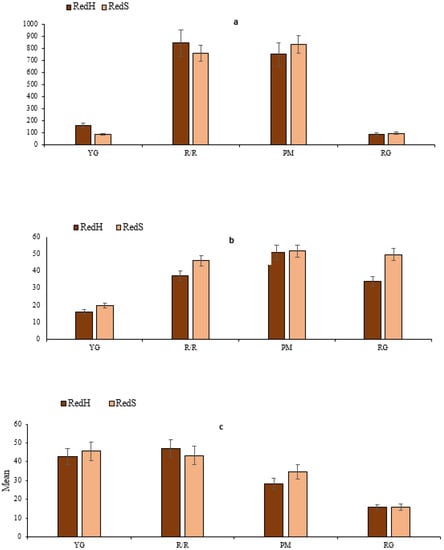 The levels of phenolics and bioaccessible phenolics in potato cultivars mixed with roasted peppers are shown in Figure 1. Red-fleshed potato selection R/R mixed with roasted JP had the maximum amount of phenolics (2164 µg/g) followed by PM (1621 µg/g), YG (644 µg/g), and RG (339 µg/g). Similar levels of phenolics (2316 to 329 µg GAE/g FD) in the same order were obtained when mixed with roasted SD (Table 1). Higher levels of total phenolics were found in red and purple-fleshed tubers than in white and yellow cultivars [20]. These differences in total phenolic content could be attributed to various factors, including the variety, flesh color, starch content, and maturity stages [26].