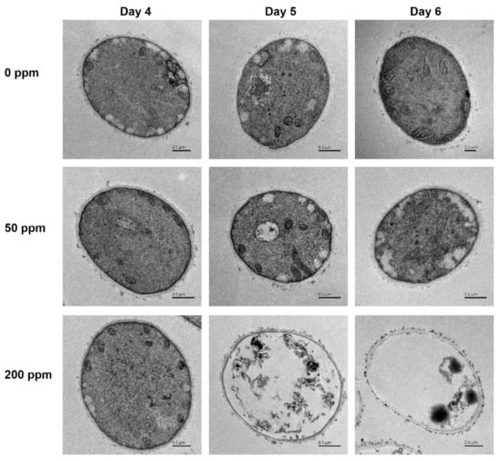 Ultra-structure analysis was performed to assess the influence of Na2SeO3 on G. lucidum mycelia. All organelles in mycelia cells with no Na2SeO3 addition and 50 ppm Na2SeO3 conditions were noticeably illustrious and well developed. There were clear round-shaped mitochondria and clear micrographs of the cell wall and cell membrane. No obvious variation was observed in G. lucidum cells treated with 200 ppm Na2SeO3 on the 4th day; noticeably, degraded cells appeared from the 5th day, the organelles inside the cell were damaged and degradation changes occurred, the electron density of the cell wall was not uniform, and cytoplasmic structure, organelles, and vacuoles disappeared; however, the cell shape was basically intact. As shown in Figure 2, small particles appeared in mycelia cells cultured with 200 ppm Na2SeO3 on the 5th and 6th days, and a clear ring of particles was noted outside the cell, which was speculated to be Se nanoparticles (SeNPs). However, no particles were observed in the cells cultured with 50 ppm Na2SeO3. It could be seen that the application of 200 ppm Na2SeO3 strongly damaged the ultrastructural profile, and the damage degree increased with the culture process, whereas there were no distinctions between the no Na2SeO3 and 50 ppm Na2SeO3 addition groups. This suggested that under the pressure of a high Se dosage, a “toxic effect” was exerted in mycelia, the organelles were seriously damaged, and insoluble substances were released from the cells, after which empty cells appeared.