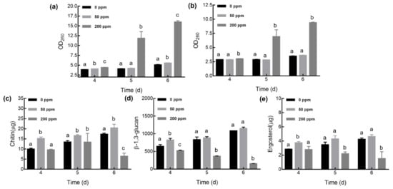 Changes in nucleic acid (a) and protein (b) and the cell wall and cell membrane components chitin (c), β-1,3-glucan (d), and ergosterol (e) in Ganoderma lucidum with selenite at different concentrations. The bars indicate the standard error of the mean (different letters indicate a significant difference on the same culture day at p < 0.05).