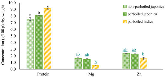 - Heinemann, R.J.B.; Fagundes, P.d.L.; Pinto, E.A.; Penteado, M.d.V.C.; Lanfer-Marquez, U. Comparative study of nutrient composition of commercial brown, parboiled and milled rice from Brazil. J. Food Compos. Anal. 2005, 18, 287–296. [Google Scholar] [CrossRef]