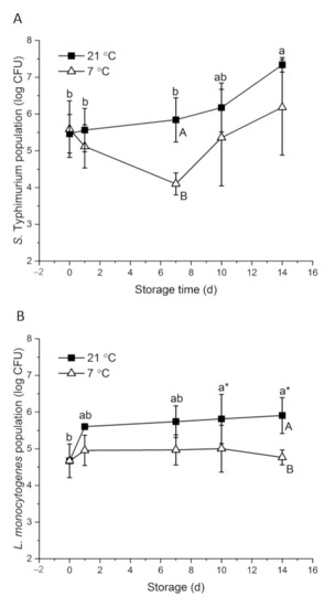 Behavior of S. Typhimurium (A) and L. monocytogenes (B) on whole papayas at 21 and 7 °C. Error bars are standard deviations (n = 3). Different lower-case letters horizontally indicate significant differences between the means of different time points at each temperature (p < 0.05). Different upper-case letters vertically indicate significant differences (p < 0.05) between the means of different temperatures at the same time point. “a*” means p values were marginal, which were 0.058 and 0.059 on day 10 and day 14, respectively, compared with day 0.