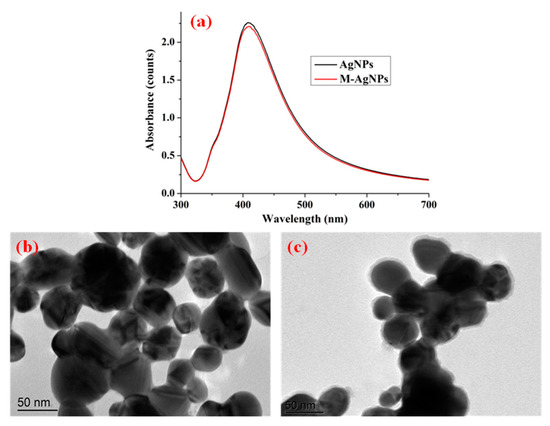 UV-vis spectra and TEM images of the substrates were employed to evaluate their optical properties and morphological characteristics, which were also used to illustrate the successful synthesis and functionalization of AgNPs. Figure 1a shows the UV-vis spectra of AgNPs and M-AgNPs. As shown in Figure 1a, a maximum-absorption peak was centred at 412 nm for AgNPs, which corresponded to our previous study [21]. The absorption value of M-AgNPs was slightly lower than that of AgNPs, one possible reason is that decanethiol was tightly adsorbed on nanostructured silver surface. The narrow and strong absorption peak indicated excellent monodispersity and plasmon properties. Figure 1b,c present TEM images of the surface morphology of AgNPs and M-AgNPs. These images indicated that AgNPs were approximately spherical with an average diameter of 45 nm, and M-AgNPs had a shadow with an average thickness of 5 nm due to the fact that the decanethiol was adsorbed on the surface of AgNPs.