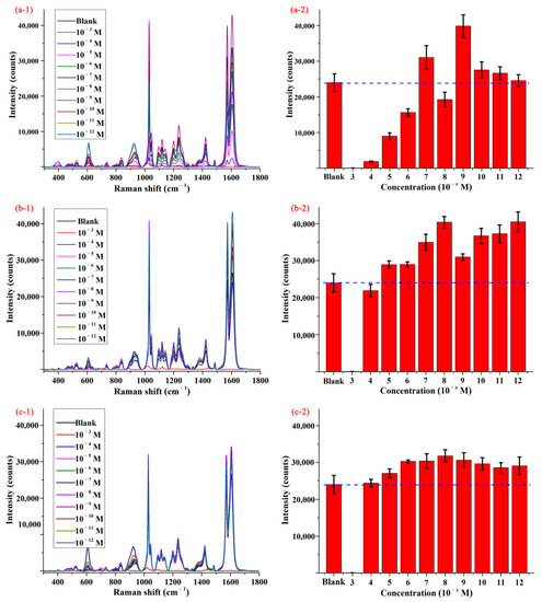 Figure 2(a-1–c-1) display the SERS spectra of pymetrozine obtained by using different substrates, and the spectrum of pymetrozine based on AgNPs was given as control. As shown in the figures, the characteristic peaks of pymetrozine were located at 610, 924, 1030, 1097, 1121, 1203, 1237, 1423, 1572, and 1606 cm−1, most of them (such as 1030, 1572, and 1606 cm−1) were consistent with previous study [28]. The intensities of the characteristic peak at 1572 cm−1 based on different substrates were given in Figure 2(a-2–c-2). As shown in these figures, compared with AgNPs, the functionalized AgNPs had a stronger enhancement effect on signal of pymetrozine, which means the sensitivity of AgNPs to pymetrozine can be improved by modifying its surface. The possible reason is that a layer of thiols was formed on the surface of AgNPs via the Ag-S bond between silver and thiol, and the chemical interaction between thiol and pymetrozine promoted the aggregation of pymetrozine on the surface of AgNPs, which can increase the adsorption capacity of the pymetrozine molecules on AgNPs [32,33,34]. An interesting phenomenon was that AgNPs functionalized by different chemicals with different concentrations presented a different enhancement effect on pymetrozine, and even some of them had negative impact on the SERS signal enhancement of pymetrozine. This was attributed to the following possible reasons: (i) the adsorption capacity of the thiol molecules is related to the length of carbon chain; and (ii) the high concentration of thiol may lead to aggregation of AgNPs. Comparing the results in Figure 2, AgNPs modified by decanethiol with the concentration of 1.0 × 10−8 mol/L were selected as active substrate for SERS detection.
