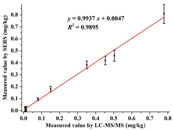 The residual amount of pymetrozine in the authentic cabbage samples were tested by SERS and LC-MS/MS simultaneously. The detection curve of pymetrozine by LC-MS/MS is given in Figure S1. The LOD and LOQ of the LC-MS/MS was 0.11 and 0.37 μg/L, respectively. The results and correlation analysis between the two methods are presented in Figure 5. As shown in Figure 5, the correlation equation of the two methods was y = 0.9937 x + 0.0047, and the R2 = 0.9895, which revealed the excellent correlation between SERS and LC-MS/MS. All these results indicated that the developed SERS method was suitable for monitoring pymetrozine residues in real cabbage samples, which has great potential for quantitative detection of pymetrozine in authentic food products.