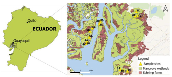 Map of the study area with indication of the sampling sites in Guayas Estuarine Basin, Ecuador.