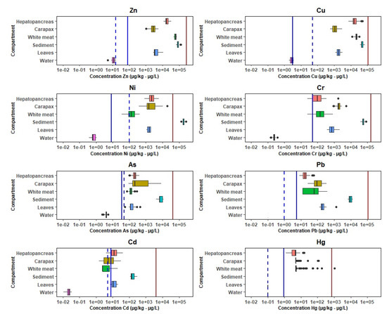 Zn had in all tissue the highest concentration as one could expect, as this element is considered essential (Figure 2) [77]. Pb, Cd, and Hg had in all tissue the lowest concentrations. For Cu, Ni, As, and Cr, the order was variable depending on the tissue. Cd is known to accumulate more in the brown meat of crabs [78], which was also the case for the red mangrove crab under study. Cadmium concentrations in the hepatopancreas were on average twice as high as in the white meat; however, all concentrations in both tissues were below the maximum level (ML) in crustaceans of 0.5 mg/kg wet weight [79]. The same MLs were set by EFSA for Pb and Hg concentrations in crustaceans, and again, the levels of Pb and Hg in the red crab white meat were below the MLs [80,81].