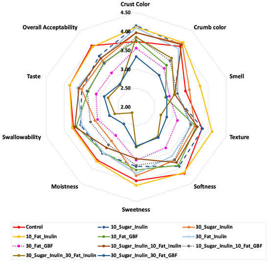However, mean values of crumb colour were significantly less compared to control in samples containing GBF (i.e., 10_Fat_GBF, 30_Fat_GBF and 30_Sugar_Inulin_30_Fat_GBF) due to the darker colour of incorporated fibres (see Figure 3). No significant differences were reported for smell, but texture and softness scored lower in samples that contained 30% GBF and the ones with the highest fibre content including 30_Sugar_Inulin_30_Fat_Inulin and 30_Sugar_Inulin_30_Fat_GBF due to the significant firmer texture of these formulations. Sweetness was not significantly influenced by sugar reduction in 10_Sugar_Inulin, 30_Sugar_Inulin or 10_Sugar_Inulin_10_Fat_Inulin and 10_Sugar_Inulin_10_Fat_GBF possibly indicating that sugar is added in excessive amounts in commercial muffins and highlighting a considerable margin of reduction. Mean values of moistness, swallowability, taste and overall acceptability were comparable with control even at 30% reduction of sugar or fat using inulin. However, slightly decreased values in these properties were found in 30_Fat_GBF, 30_Sugar_Inulin_30_Fat_Inulin and 30_Sugar_Inulin_30_Fat_GBF (p < 0.05). In conclusion, panellists showed compatible overall acceptability with control in seven out of ten reduced sugar and/or fat formulations including 10_Sugar_Inulin, 30_Sugar_Inulin, 10_Fat_Inulin, 10_Fat_GBF, 30_Fat_Inulin, 10_Sugar_Inulin_10_Fat_Inulin and 10_Sugar_Inulin_10_Fat_GBF. Acceptable cakes that had a replacement of 30% sugar and/or 50% fat by inulin were also reported by Rodriguez-Garcia et al. (2014) [34].