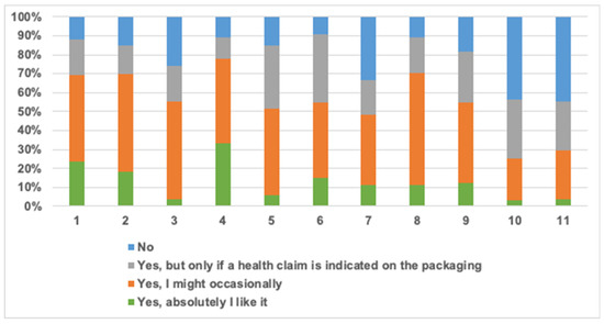 Figure 4 illustrates the intent of purchase ‘Yes, I absolutely like it’, ‘Yes, I might occasionally’, ‘Yes, but only if a health claim is indicated on the packaging’ and ‘No’. Results show a high purchase intent ranging from 55.6% to 90.9% in all muffin formulations.