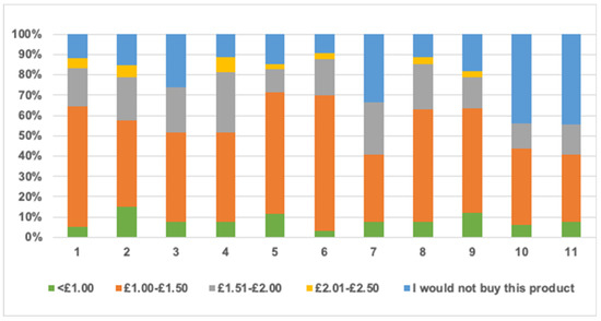 Regarding muffins price, generally, the price range of £1.00–£1.50 had the highest votes for all formulations followed by £1.51–£2.00 and <£1 while the most expensive price range £2.01–£2.50 had the lowest votes. Figure 5 shows that participants valued formulations that had a 10% reduction of sugar and/or fat at a higher price than those with a 30% reduction. This pattern was consistent and reliable in all formulations.